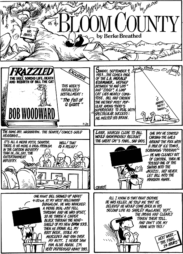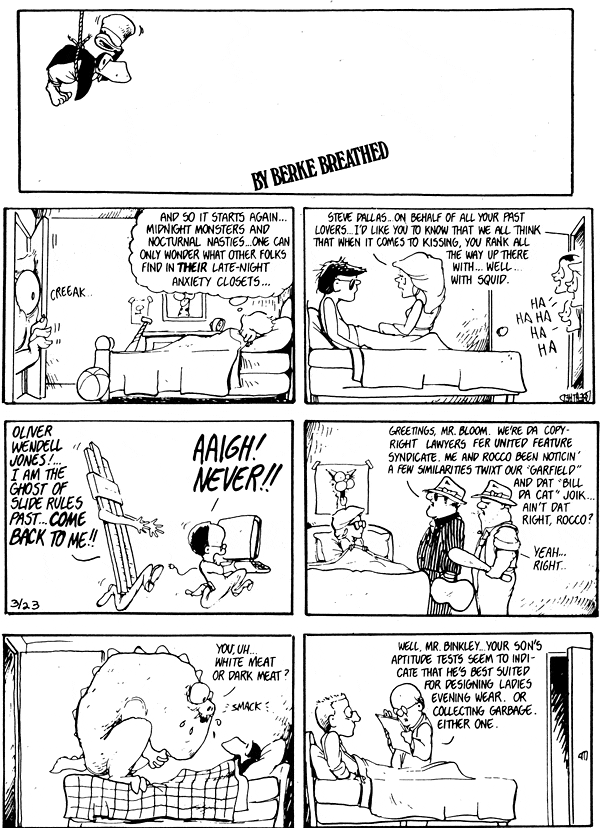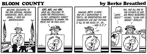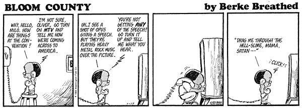 ![]() "Liberal, shmiberal. That should be a new word. Shmiberal: one who is assumed liberal, just because he's a professional whiner in the newspaper. If you'll read the subtext for many of those old strips, you'll find the heart of an old-fashioned Libertarian. And I'd be a Libertarian, if they weren't all a bunch of tax-dodging professional whiners." - Berkeley Breathed Meat is Murder. Sweet, delicious murder. | |